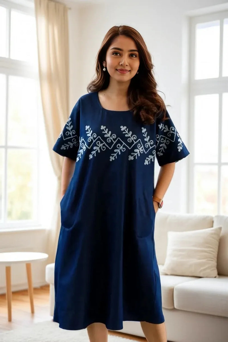 Expertly crafted from soft cotton, this Blue Embroidered Midi Dress features a flattering round neck and intricate embroidered details. Made with high-quality fabric, it offers both comfort and elegance, making it perfect for any occasion. Elevate your wardrobe with this must-have piece.