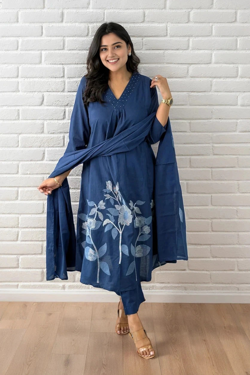 Elevate your ethnic wardrobe with this blue Floral Embroidered Kurta Set featuring intricate floral embroidery that adds timeless elegance. The set includes a finely crafted kurta paired with a matching dupatta, designed to offer both style and comfort. Ideal for festive occasions and formal gatherings, this ensemble balances traditional craftsmanship with contemporary appeal, ensuring a refined and graceful look.