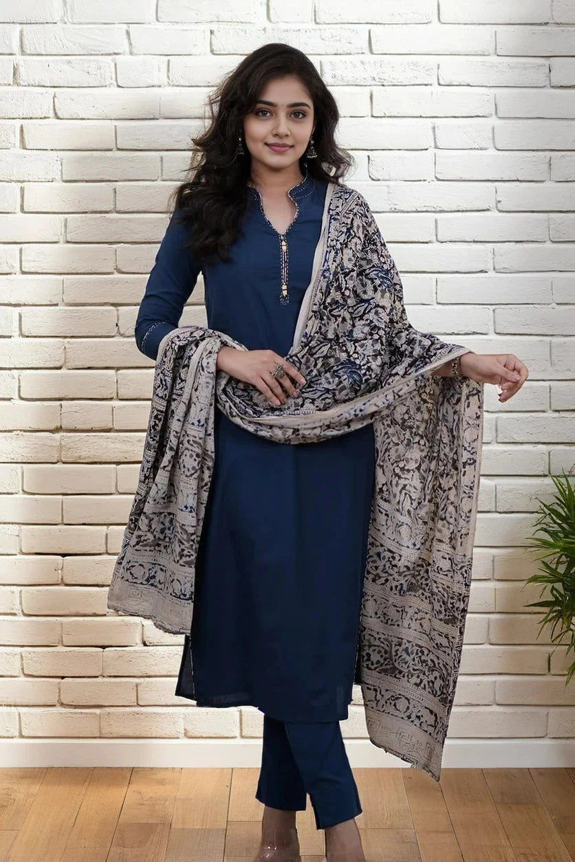 This Blue Katha Kurta Set with Dupatta features intricate katha embroidery, blending traditional craftsmanship with contemporary style. The breathable fabric ensures comfort while the coordinated dupatta adds elegance, making it suitable for festive occasions and formal gatherings. Designed for a graceful silhouette, this set combines aesthetic appeal with ease of wear.