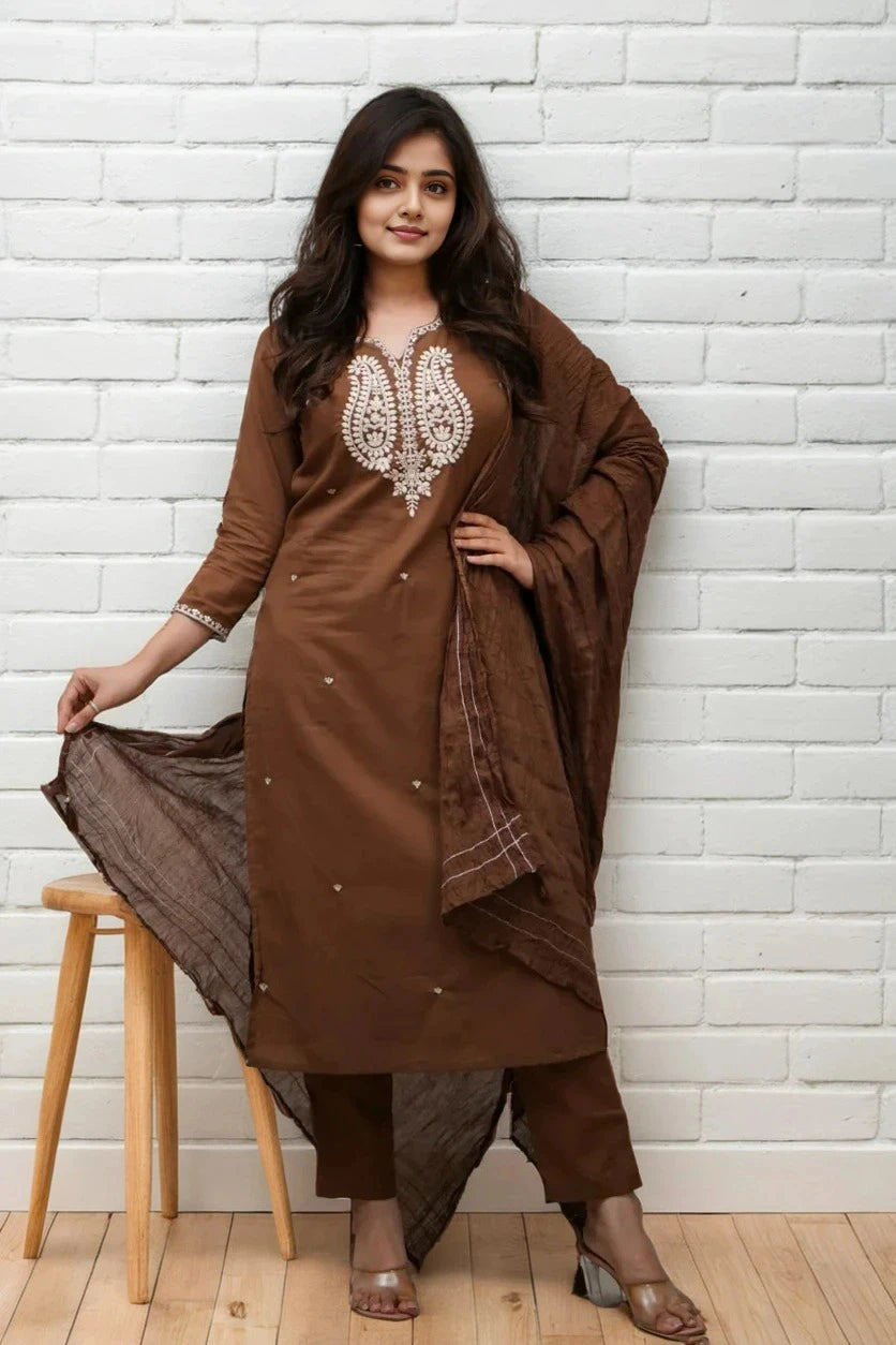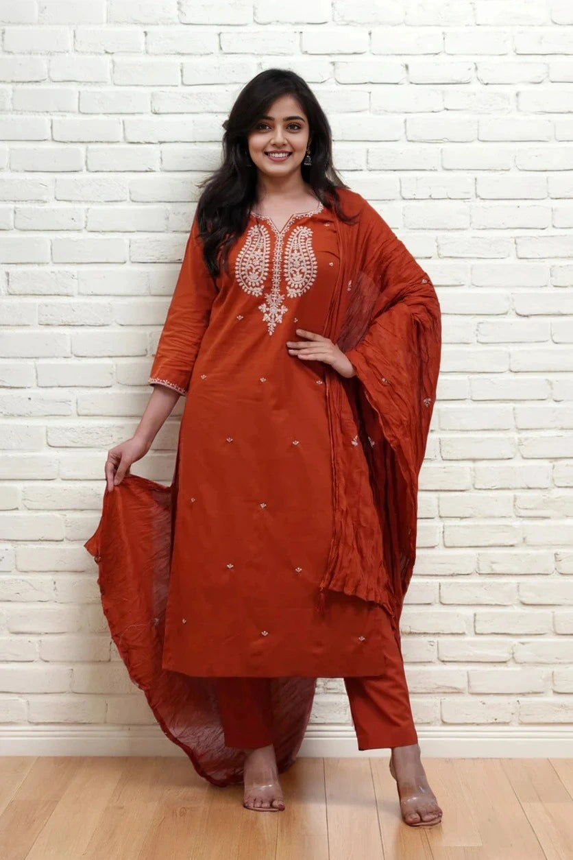 This Orange Embroidered Kurta Set features a straight-fit kurta adorned with intricate floral embroidery, offering a refined and elegant look. The coordinating dupatta complements the ensemble, enhancing its traditional charm while providing comfort and style. Perfect for festive occasions and cultural gatherings, this set blends craftsmanship with wearable sophistication.