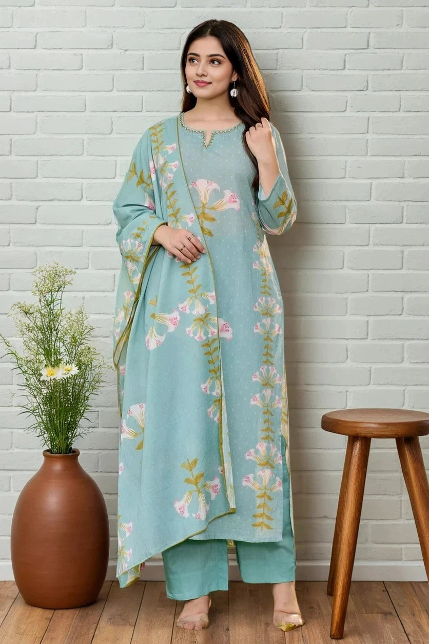 Elevate your ethnic wardrobe with this Turquoise Kurta Set featuring intricate applique work that adds delicate texture and depth. Crafted for both elegance and comfort, the set includes a coordinating dupatta to complete the look. Its vibrant Turquoise hue enhances your presence, making it ideal for festive occasions or casual celebrations. Experience a refined blend of traditional artistry and modern silhouette with this expertly designed ensemble.