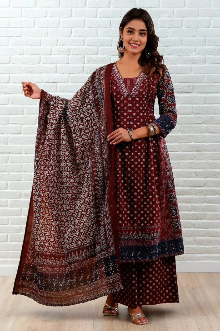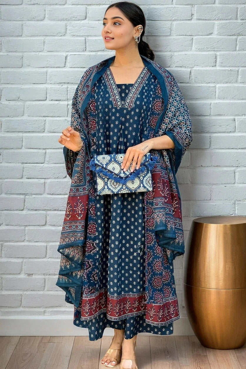 Embrace timeless elegance with this women's indigo blue ethnic print kurti set, crafted from breathable cotton for all-day comfort. The intricate traditional print celebrates cultural heritage while the coordinated dupatta adds versatility to your ensemble. Perfect for festive occasions, casual gatherings, or everyday wear, this three-piece set combines authentic design with practical wearability. The natural cotton fabric ensures durability and easy maintenance, making it an essential addition to any wardrobe seeking sophistication with cultural authenticity.