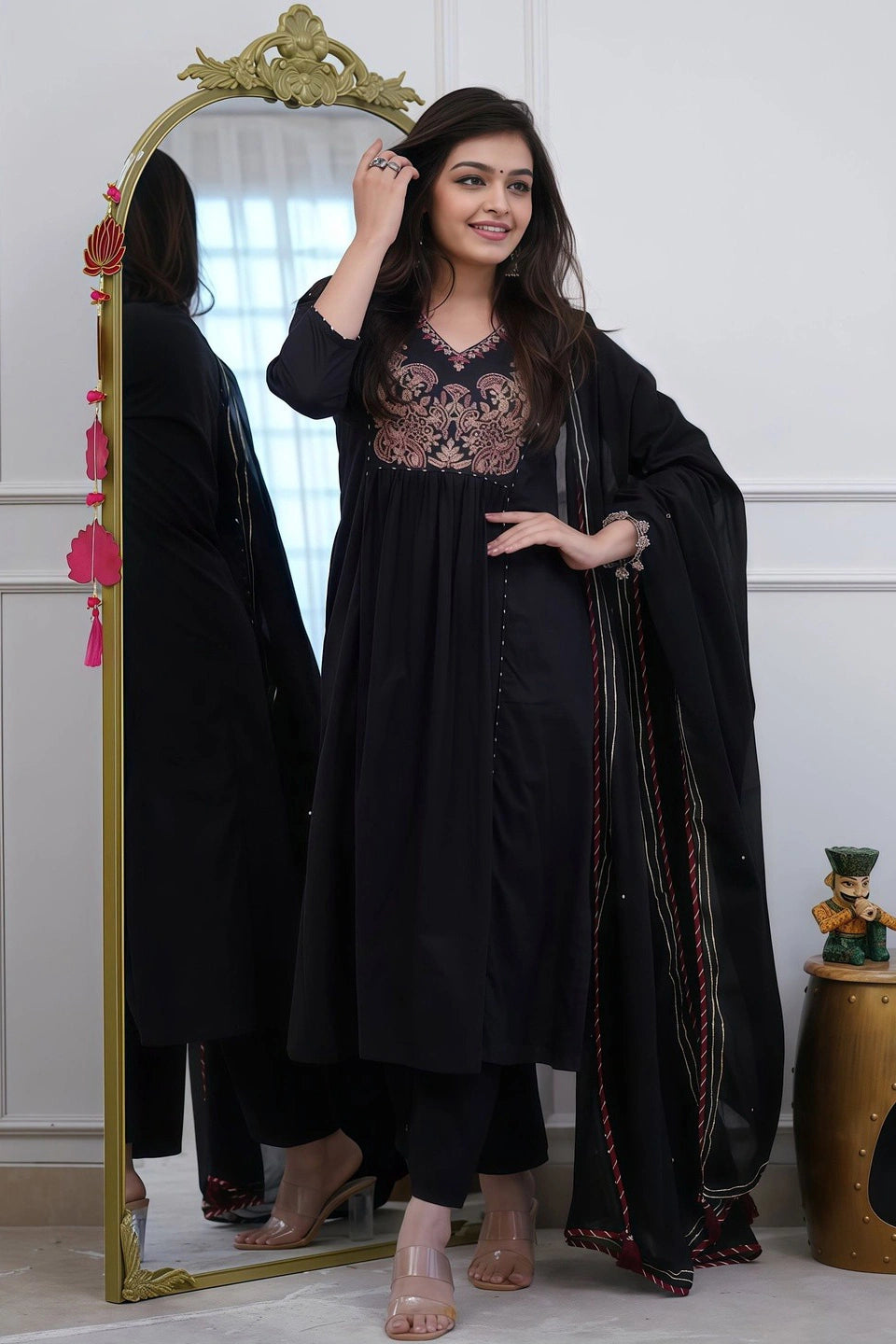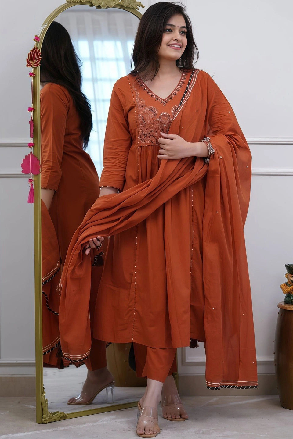 Elevate your ethnic wardrobe with this sophisticated rust cotton Anarkali ensemble. Crafted from breathable cotton fabric, the intricately embroidered kurti features a flattering A-line silhouette that drapes elegantly. The set includes coordinated straight pants and a flowing dupatta, offering a complete, polished look for festive occasions, celebrations, or everyday wear. The rich black tone complements diverse skin tones while the detailed embroidery adds timeless appeal. Perfect for those seeking comfort without compromising on style, this three-piece collection delivers versatility and grace in traditional Indian fashion.
