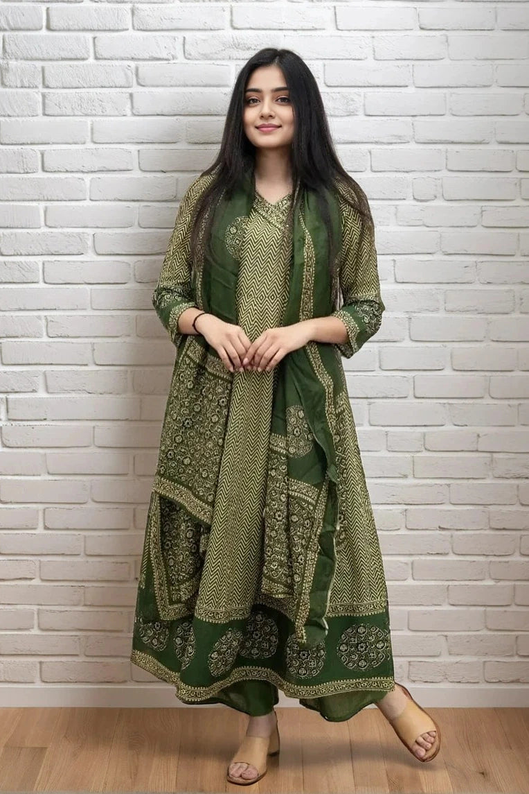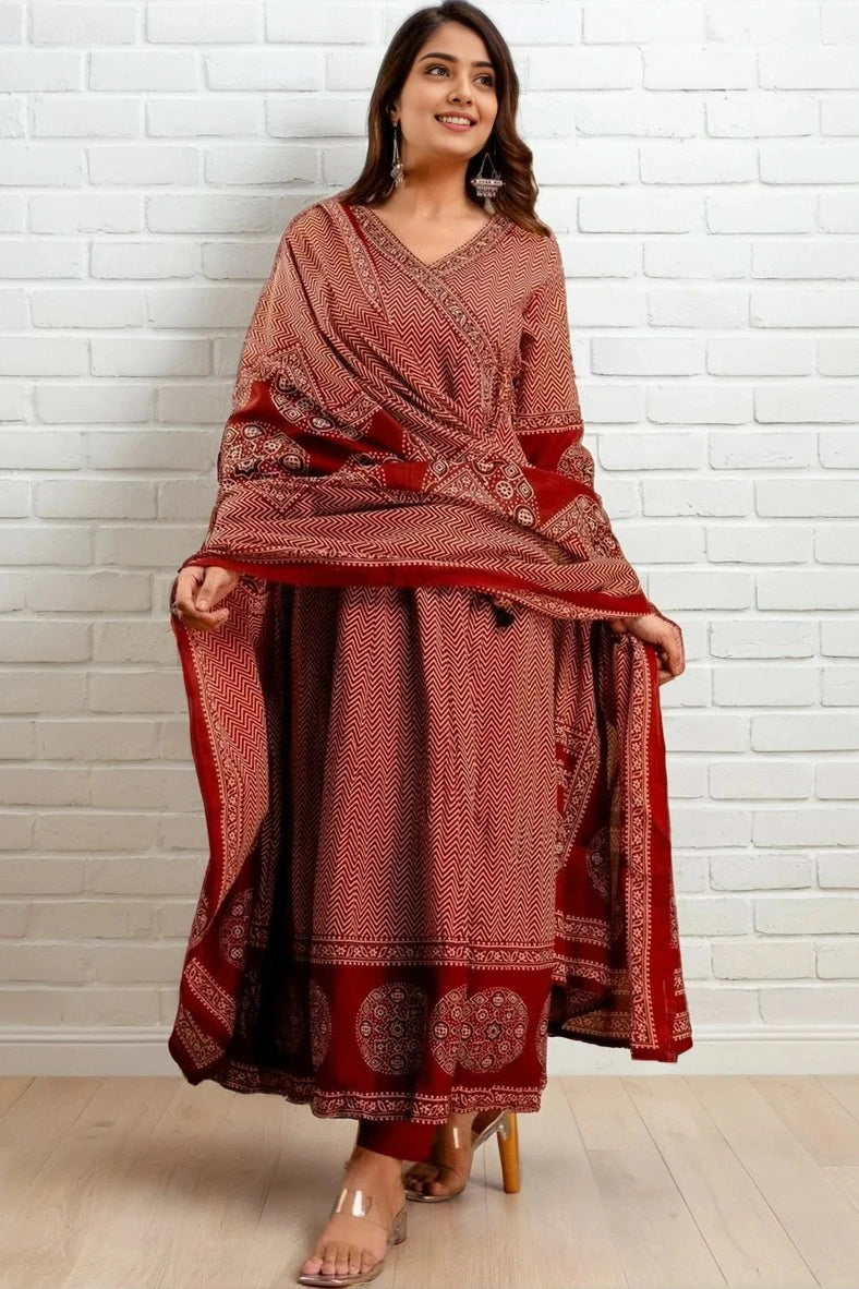 Embrace timeless elegance with this verdant cotton kurta set, meticulously crafted for the discerning wearer. The ensemble features a beautifully printed kurta in rich red hues, paired with coordinating trousers and a flowing dupatta that completes the traditional silhouette. Constructed from breathable cotton, this set offers comfort without compromising on style, making it ideal for festive occasions, cultural celebrations, or everyday wear. The intricate ethnic prints showcase authentic craftsmanship, while the coordinated dupatta adds versatility to your styling options. Perfect for those who appreciate quality fabrics and refined traditional aesthetics.