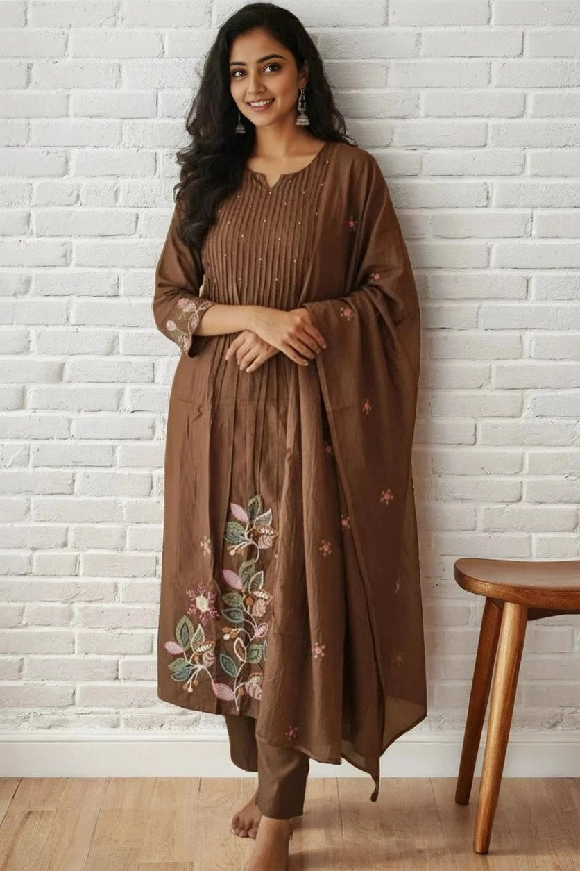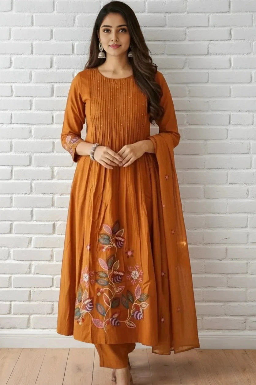 This mustard Pintex kurta set combines refined aesthetics with functional design, featuring hand-crafted floral embroidery that reflects traditional artisanal excellence. The three-piece ensemble—kurta, bottoms, and dupatta—provides a polished silhouette suitable for weddings, festivals, and formal gatherings. The warm mustard tone offers universal flattery while the intricate embroidery detailing creates visual dimension and sophistication. The included dupatta enhances styling flexibility, allowing you to adapt the look from traditional draping to contemporary interpretations. Constructed with quality fabrics and meticulous embroidery work, this set represents a worthy investment in timeless ethnic wear that transcends seasonal trends.