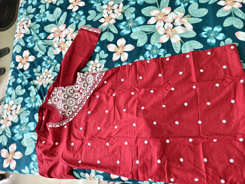 Expertly crafted from soft cotton, this 2-piece kurta set showcases a classic straight design with a sophisticated mandarin neck. The intricate embroidery work adds a touch of elegance to this versatile piece. Perfect for any occasion, experience the comfort and style of this red embroidered kurta set.