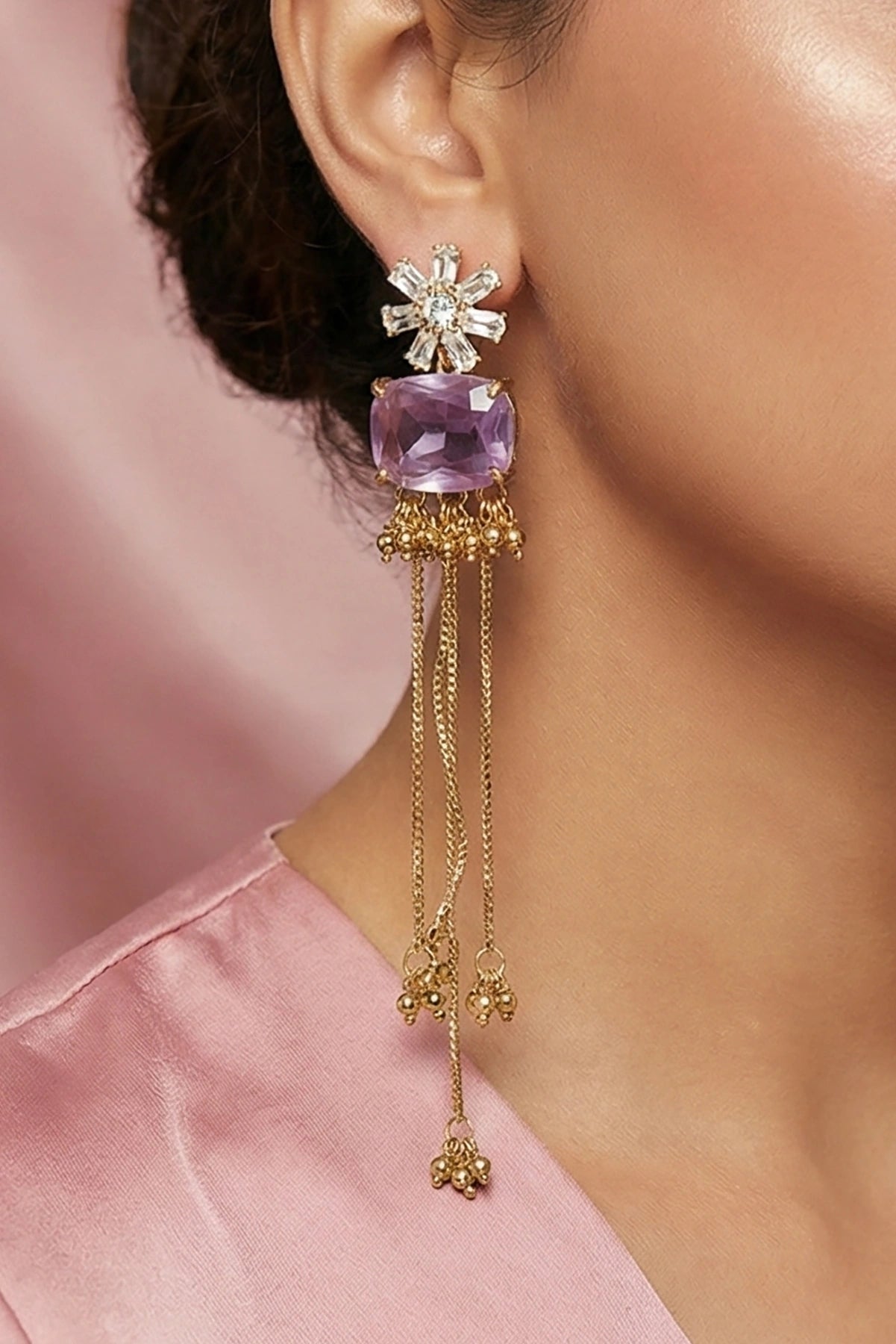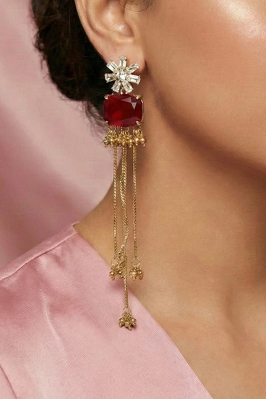 Red Crystal Drop Earrings with Golden Tassels Elevate your jewelry collection with these sophisticated drop earrings, featuring lustrous red crystals suspended from delicate golden tassel accents. The rich crimson hue paired with warm metallic detailing creates a striking contrast that transitions seamlessly from day to evening wear. Each piece is crafted to catch light beautifully, adding dimension and elegance to any ensemble. The tassel design introduces movement and texture, making these earrings a versatile statement accessory for both casual and formal occasions. Perfect for those who appreciate refined craftsmanship and timeless style.