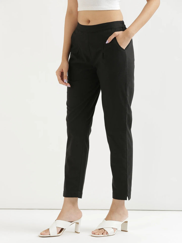 Crafted from breathable cotton, these Black trousers offer both comfort and durability for everyday wear. Designed specifically for women, they provide a tailored fit that enhances mobility while maintaining a polished look. Ideal for casual or professional settings, these trousers combine practicality with style, making them a versatile addition to any wardrobe.
