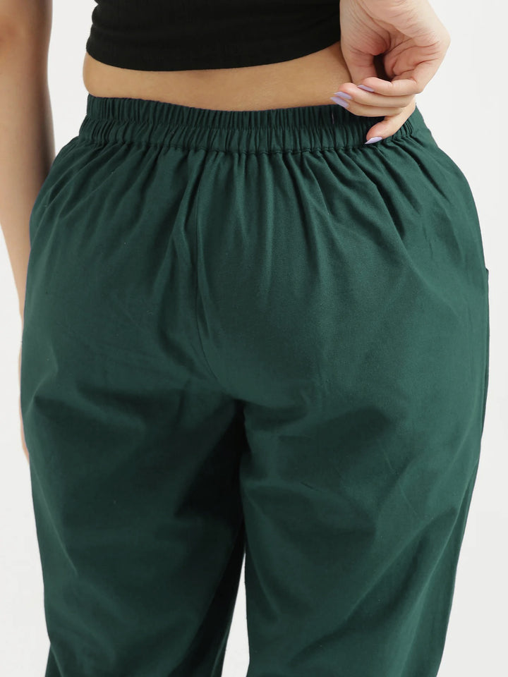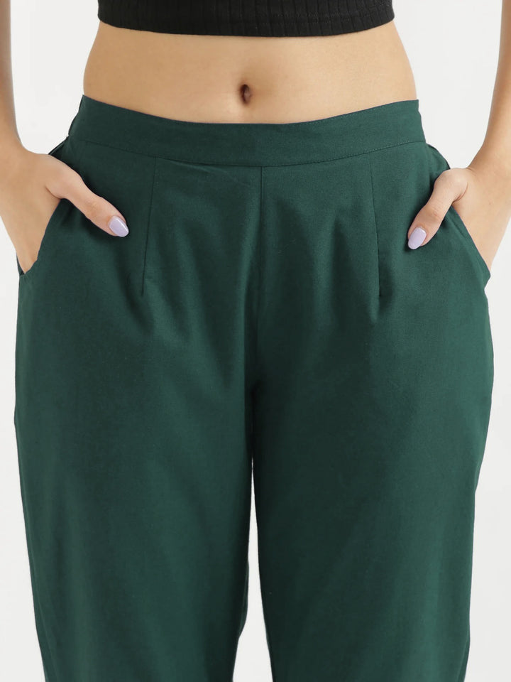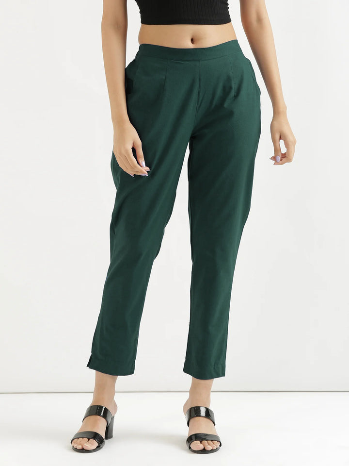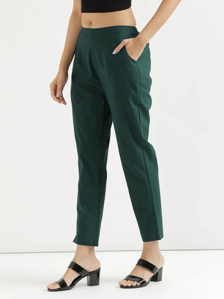 Crafted from breathable cotton, these green trousers offer both comfort and durability for everyday wear. Designed specifically for women, they provide a tailored fit that enhances mobility while maintaining a polished look. Ideal for casual or professional settings, these trousers combine practicality with style, making them a versatile addition to any wardrobe.